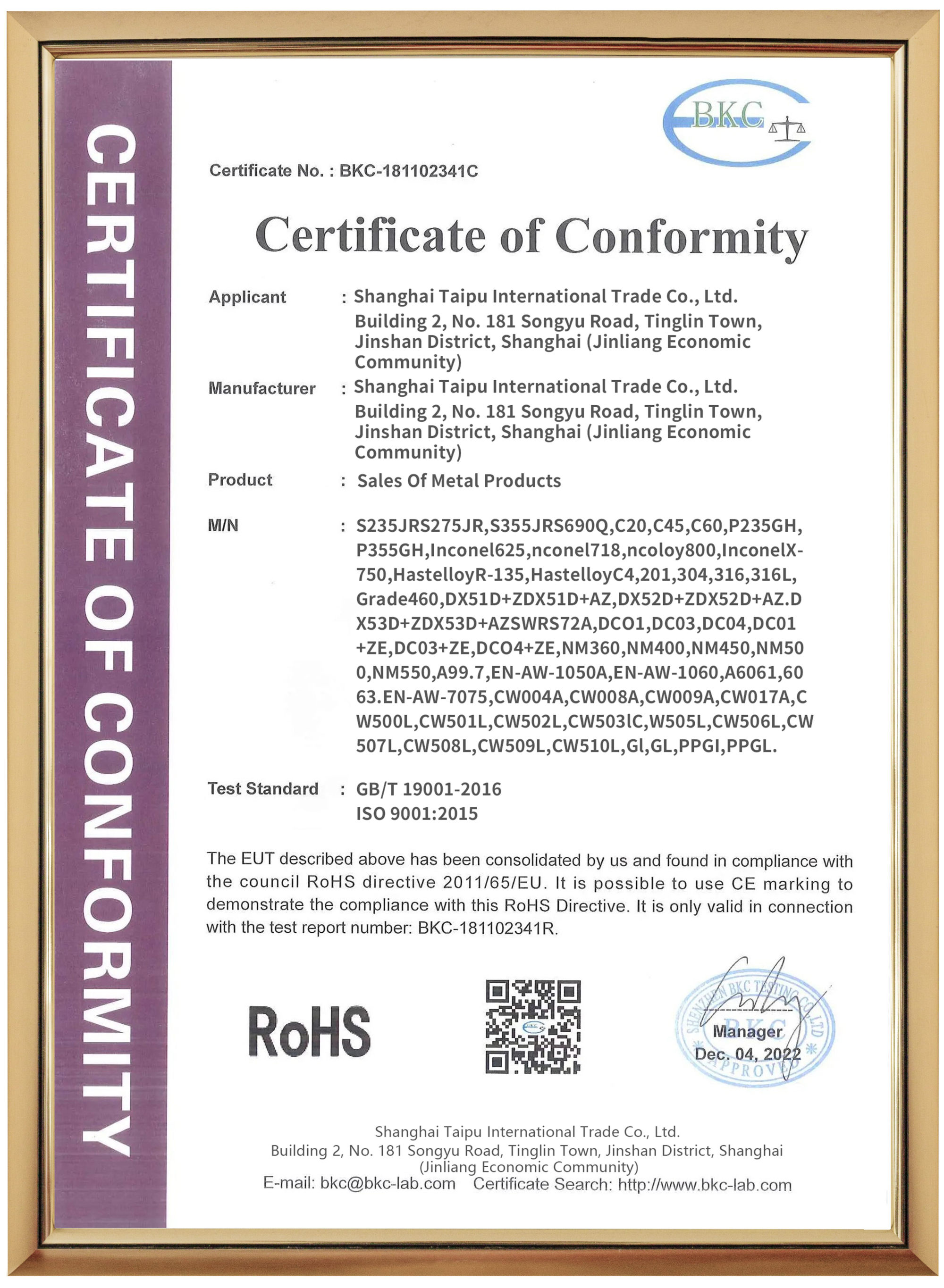 Nuestros productos cuentan con certificados CE/EN10204/ASTM/Sociedades de Clasificación/CASO/BIS y otros. Todos los pedidos están sujetos a inspección TPI (SGS/TUV/BV, etc.). Nuestra fábrica incorpora equipos de producción avanzados extranjeros para lograr inteligencia, modernización y mejora, satisfaciendo las diferentes necesidades de los clientes. ¡Amigos son bienvenidos a visitar nuestra fábrica en cualquier momento, bienvenidos a China!